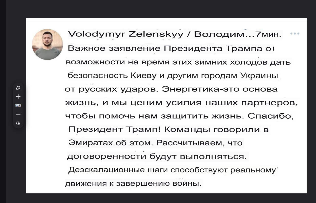 Зеленский подтверждает "возможность отдохнуть от русских ударов". Похоже на ранее упомянутые договорённости не бить по энергообъектам.