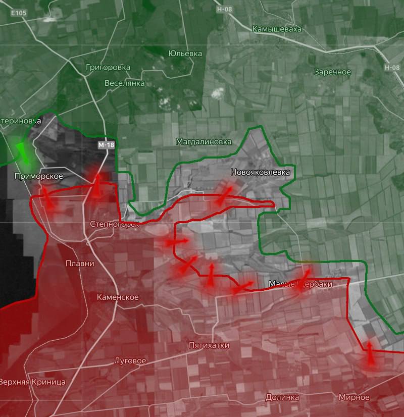 «На Запорожском направлении идут бои за Приморское и, по некоторым данным, за Речное. В Приморском значительная часть села представляет собой «слоёный пирог» из позиций сверхмалых групп