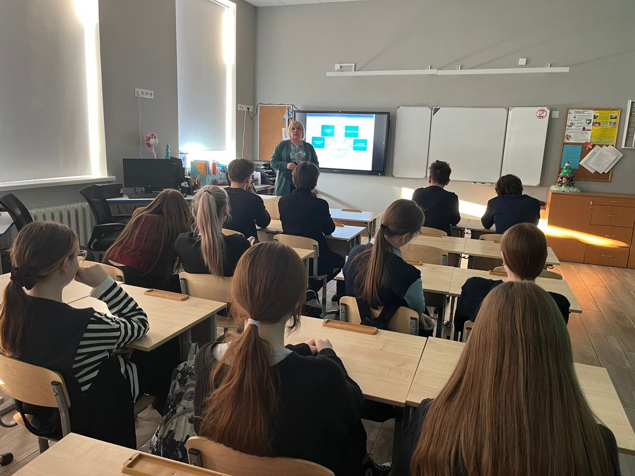 29 января председатель территориальной избирательной комиссии Волосовского района Марианна Понамаренко провела в рамках данного курса урок по избирательному праву. Его участниками стали 10 и 11-классники.
