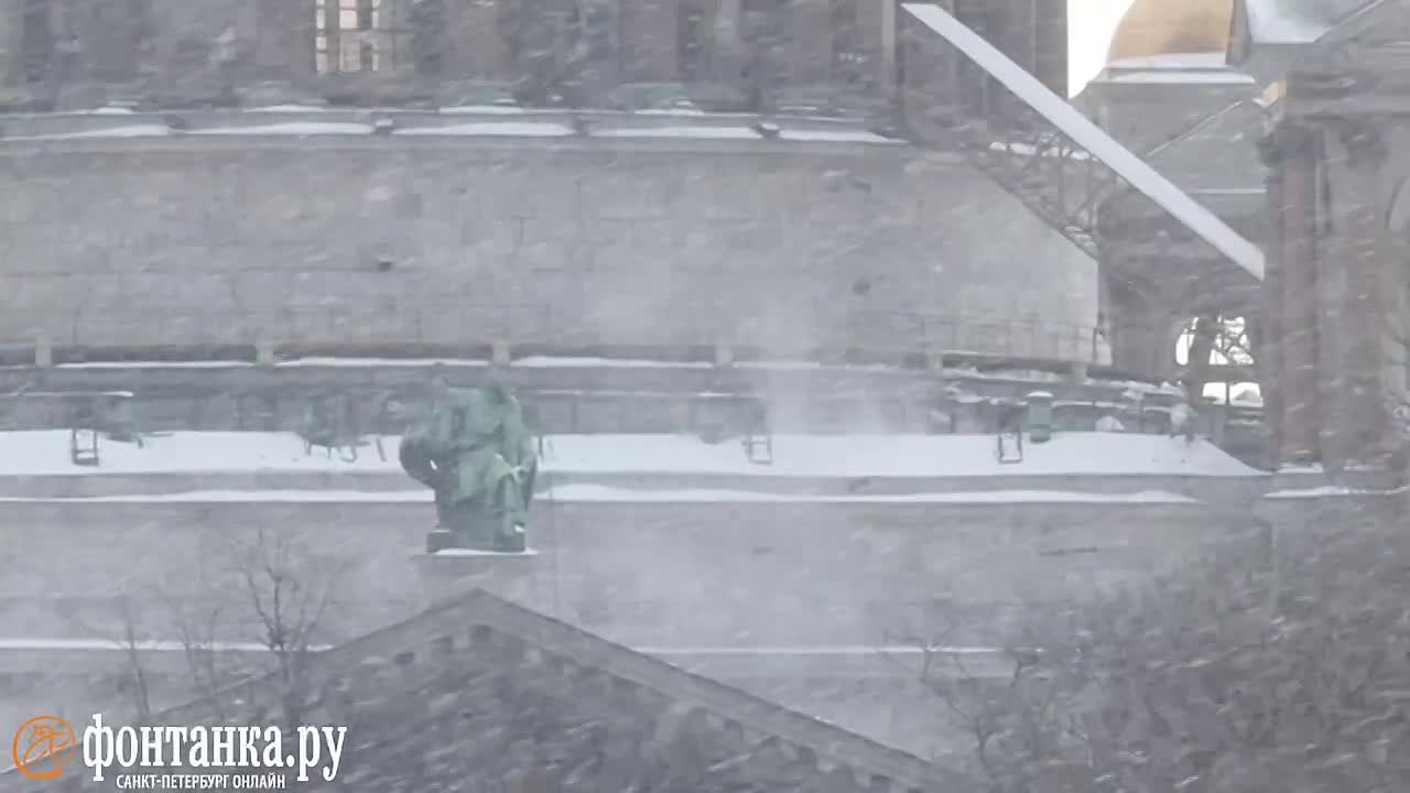 Пока рабочие очищают крышу Исаакиевского собора, сам собор накрывает новая партия снега. Петербургская зима не сдается