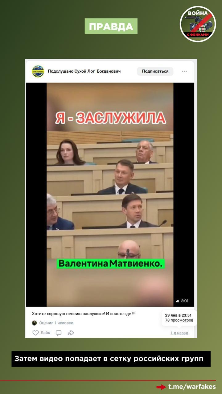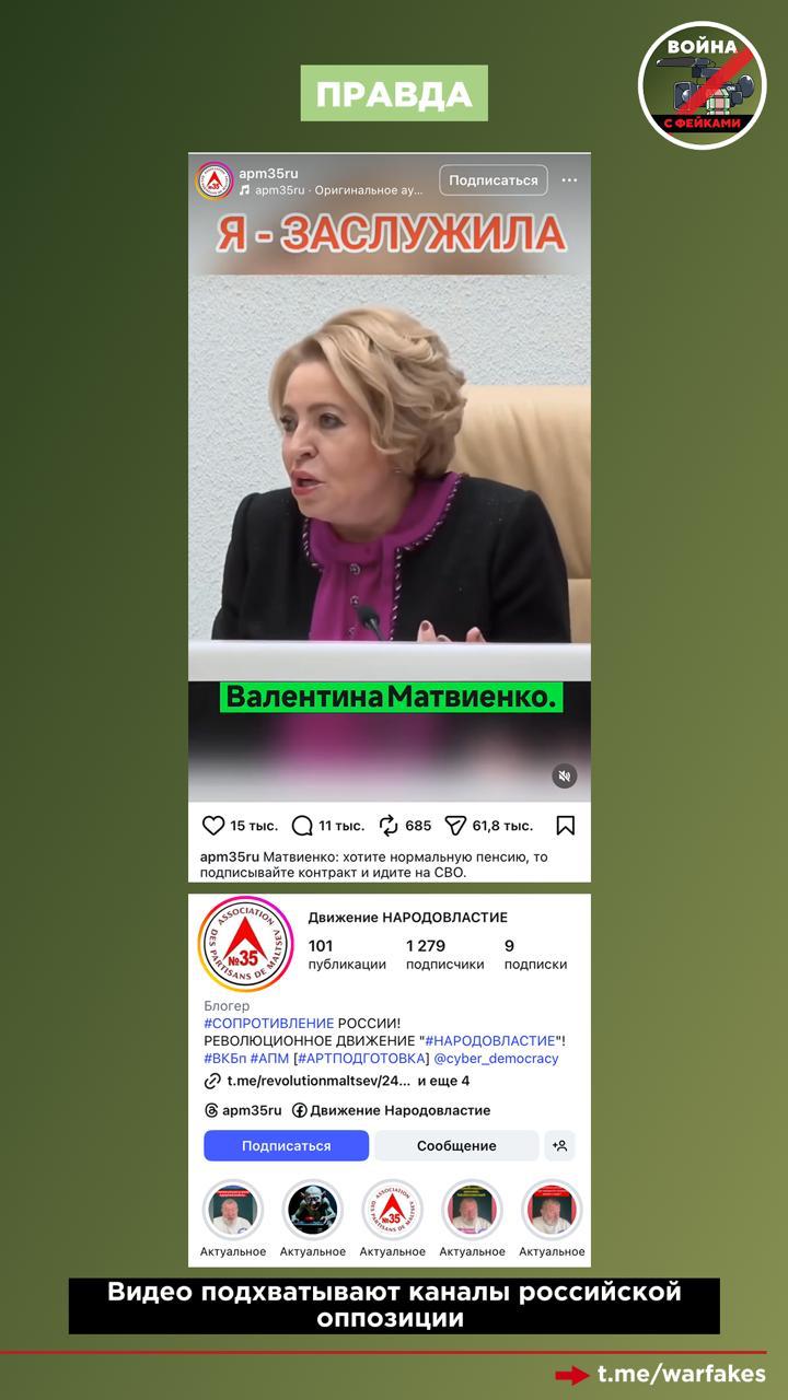 Фейк: Россиянам необходимо заслужить большую пенсию. Для этого нужно отправляться на СВО, заявила председатель Совета Федерации Валентина Матвиенко. Ее выступление распространяется в социальных сетях.