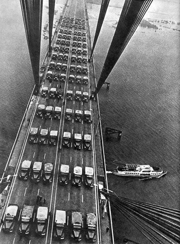 Испытания на прочность Московского моста перед вводом в эксплуатацию. Киев, 1976 год.