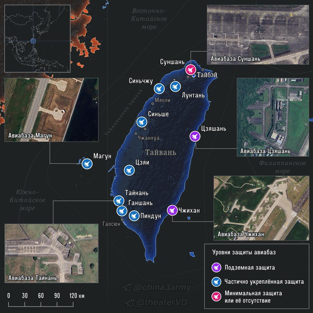 На карте представлен уровень защиты на каждой из авиабаз Тайваня, позволяющий оценить текущее состояние и различие инфраструктуры на объектах.