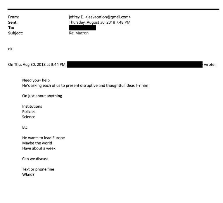 Также Эпштейн выступал посредником для установления контактов между американскими бизнесменами и администрацией Макрона вне официальных каналов.