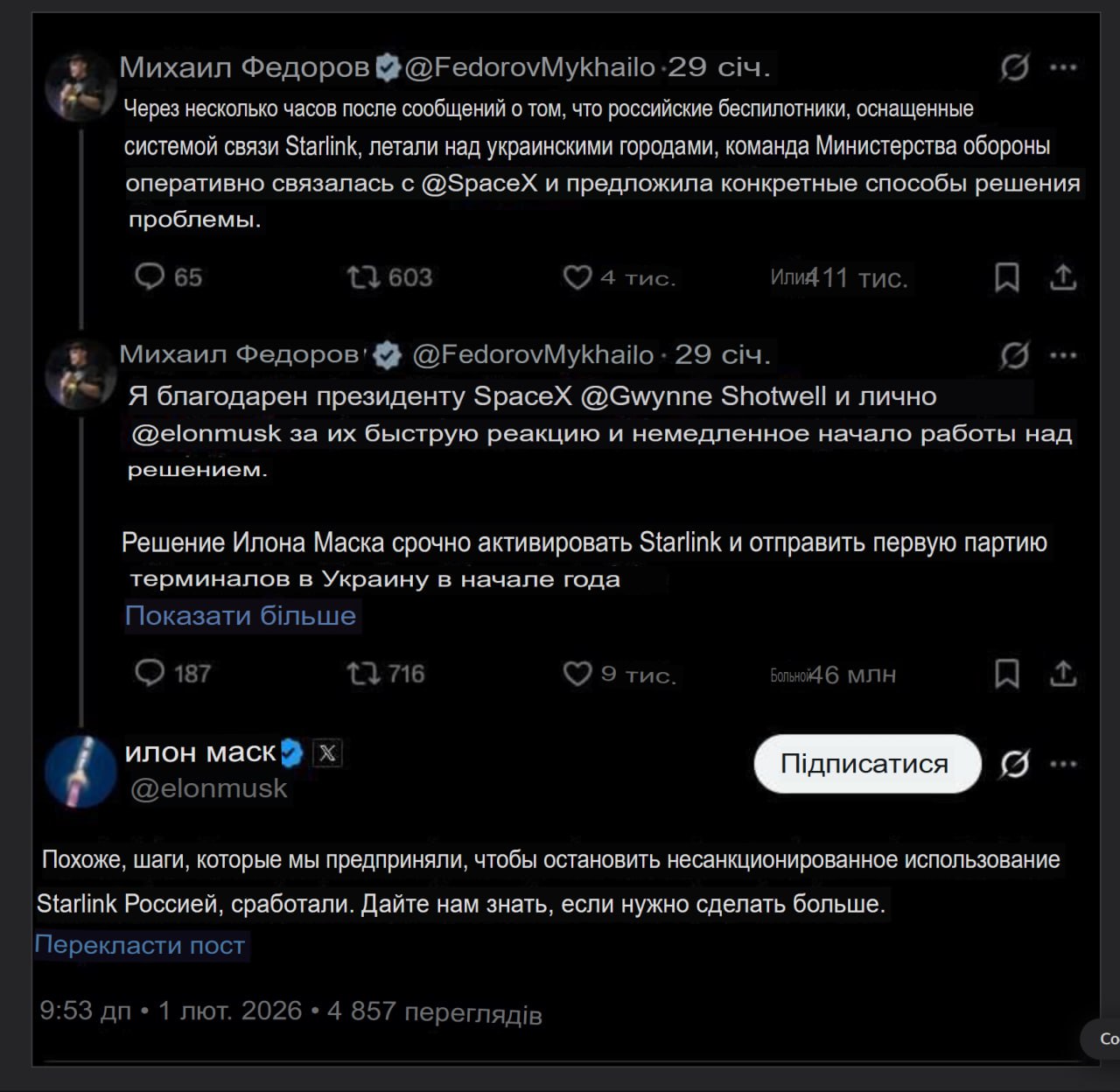 Автоматический перевод переписки министра обороны Украины Фёдорова и Маска. Американец хвастается тем, что противодействие "Старлинкам", использующимися ВС России, якобы даёт результат.