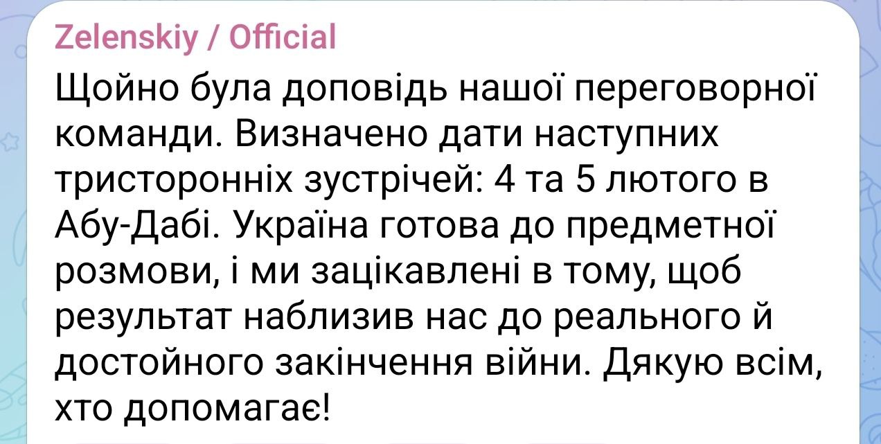 "Только что был доклад нашей переговорной команды. Определены даты трехсторонних встреч: 4 и 5 февраля в Абу-Даби. Украина готова к предметному разговору",