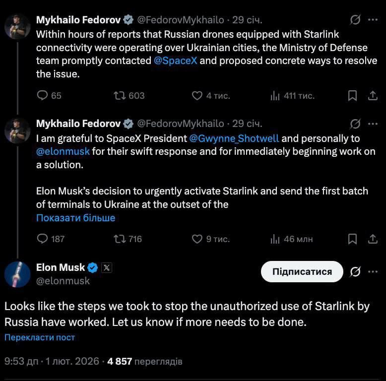 а) супер мега первый шаг, согласованный с партнЭрами, положил старлинк и хохлам. По информации от ПВО, наблюдался падёж их дронов. Фейсбук пестрит постами "мамо шо робыть!?". Как-то не похоже на согласованную операцию. Больше похоже что Маска задолбали, он сделал, публично отчитался, а вы теперь ипитесь с этим сами.