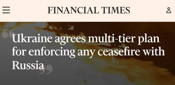 Financial Times сообщает, что ‘Украина договорилась с западными партнерами, что систематические нарушения Россией любого будущего соглашения о прекращении огня будут встречены скоординированным военным ответом со стороны Европы и США’.
