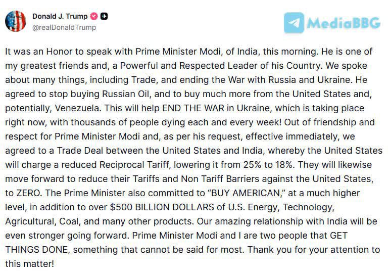 «Договорились о торговом соглашении между Соединёнными Штатами и Индией, в соответствии с которым США будут взимать сниженный взаимный тариф, снизив его с 25% до 18%».