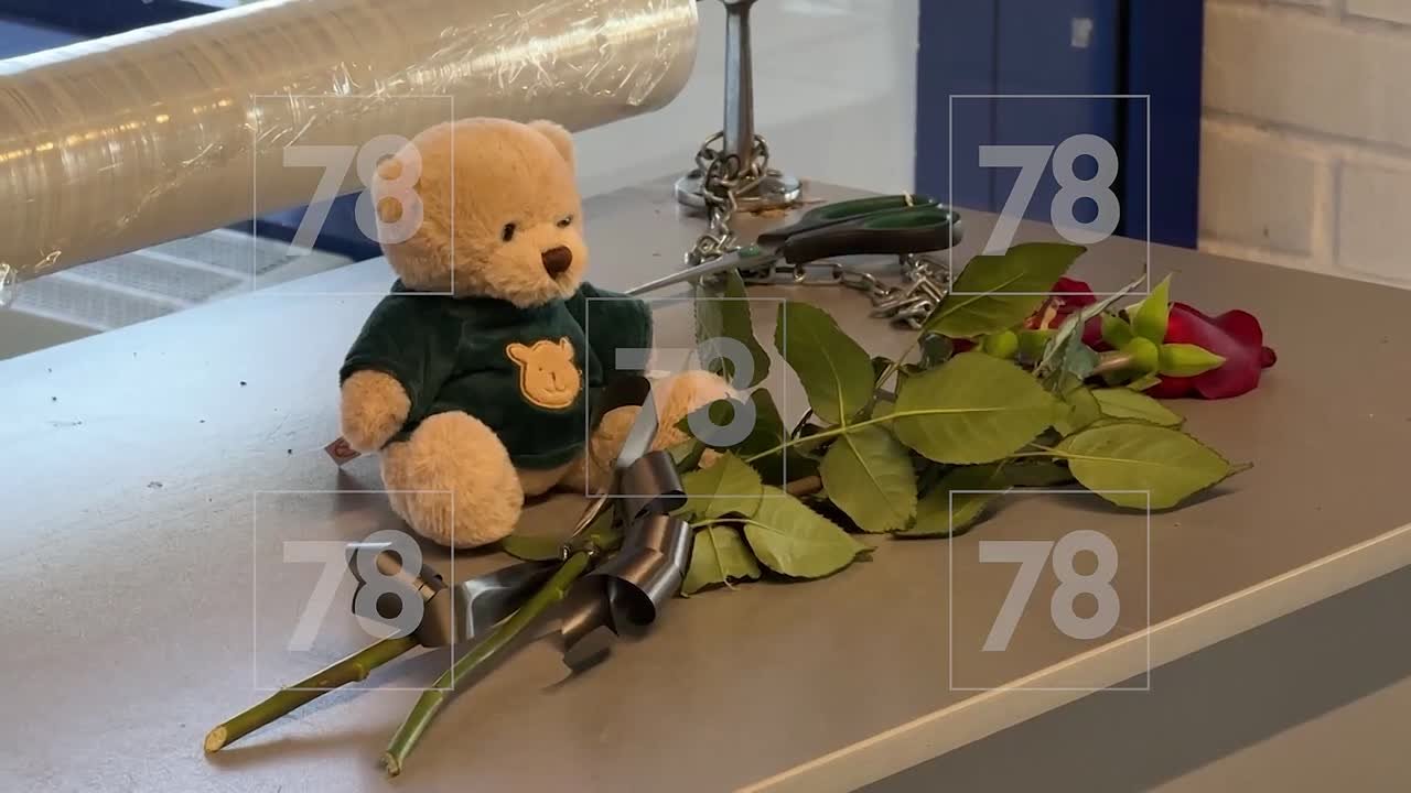 На столике у входа две розы и плюшевая игрушка.