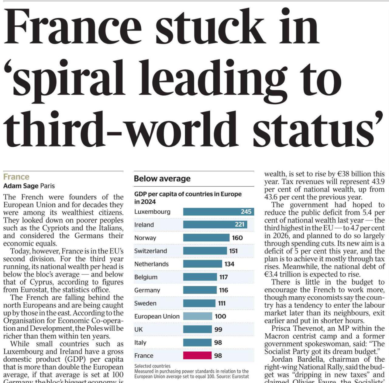 Газета сравнивает данные по ВВП на душу населения в Европе со средним показателем в ЕС и приходит к выводы: «Франция стала Аргентиной Европы».