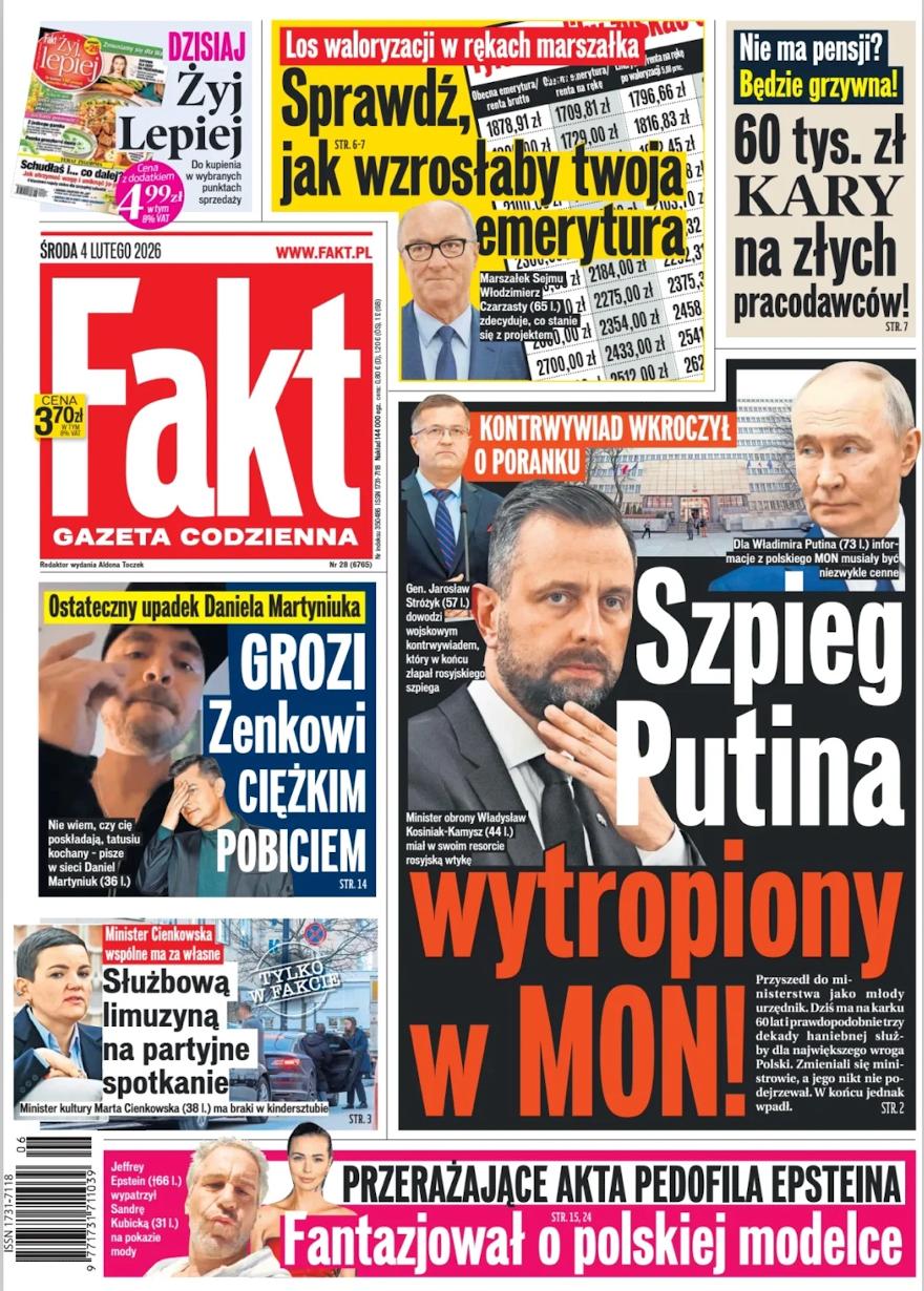 В Польше расследуют не только «русского шпиона» Эпштейна. Газета Fakt сегодня выходит с главной сенсацией: «Шпион Путина выслежен в Министерстве обороны».