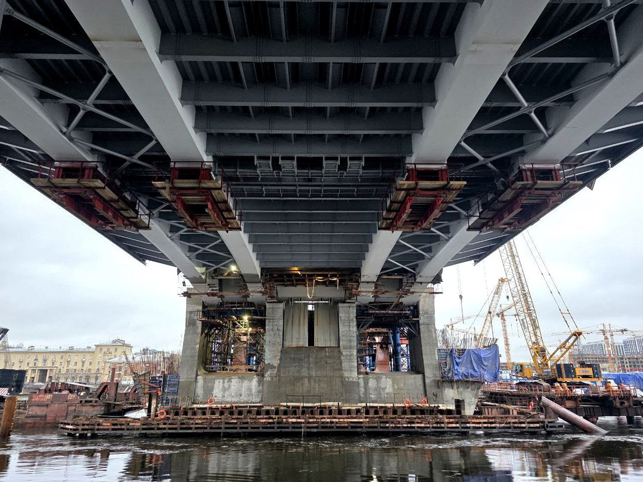 Сейчас продолжается монтаж металлоконструкций и оформление стыков разводного пролета с противовесами. Уже возведено 8 из 10 опор моста.