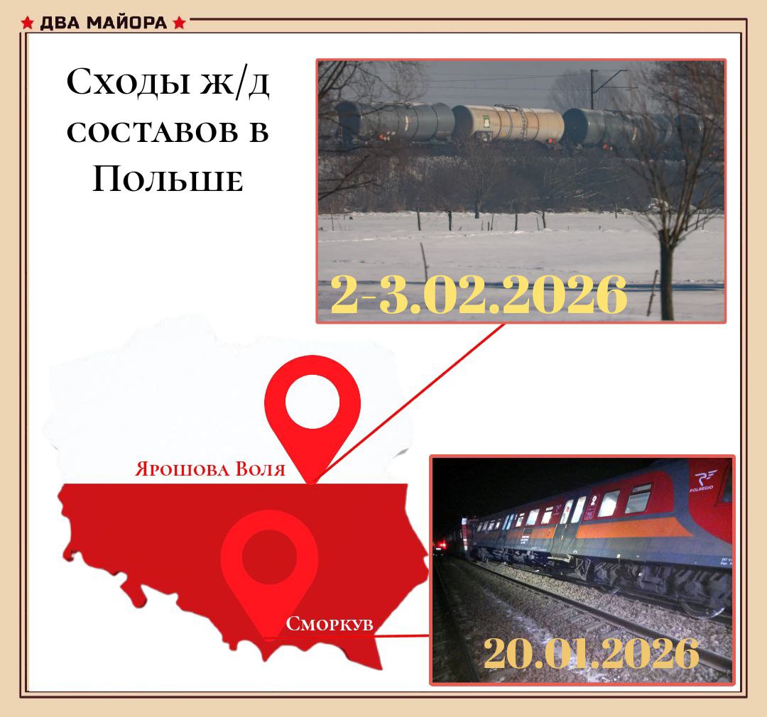 Ночью с 2 на 3 февраля 2026 года в районе деревни Ярошова Воля (Мазовецкое воеводство) произошёл сход с рельсов грузового поезда, следовавшего по маршруту Щецин – Хелм, с дизельным топливом в цистернах. С рельсов сошли до 9 цистерн, часть из них перевернулась и скатилась с насыпи высотой несколько метров. Предварительная причина – сильные морозы, вызвавшие повреждение контактной сети.