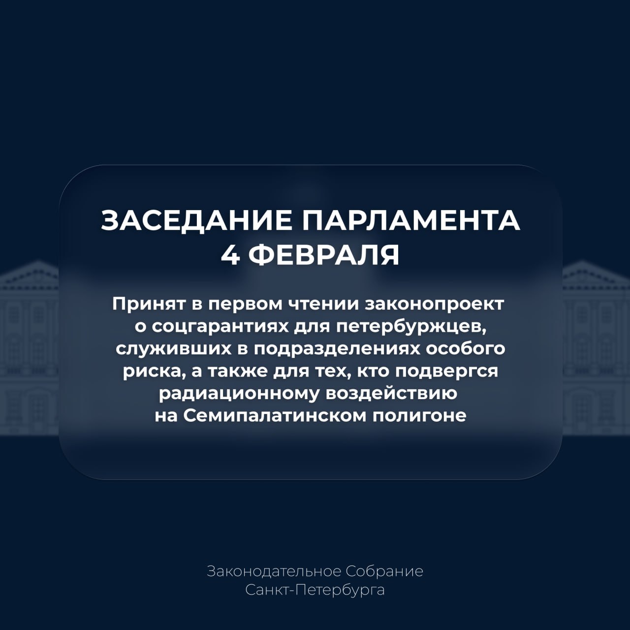 Собрание приняло в первом чтении законопроект о дополнительных соцгарантиях для петербуржцев, служивших в подразделениях особого риска, а также для тех, кто подвергся радиационному воздействию вследствие ядерных испытаний на Семипалатинском полигоне.