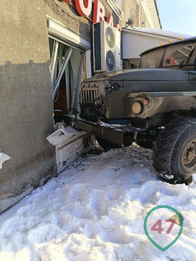 Военный «Урал» влетел в столовую «Белочка» в деревне Заклинье.
