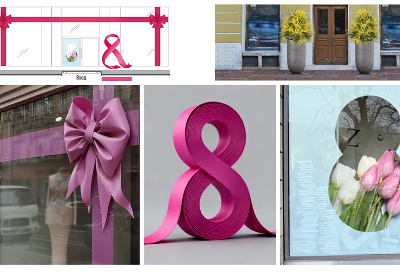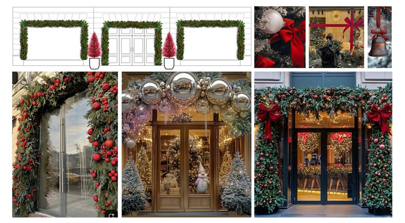 Регламентируются предпочтительные типы деревьев, цветов и других растений, которые используются как элементы украшения. Типовые решения разработаны для входных групп, окон и витрин к Новому году и 8 марта. Образцы на фото.