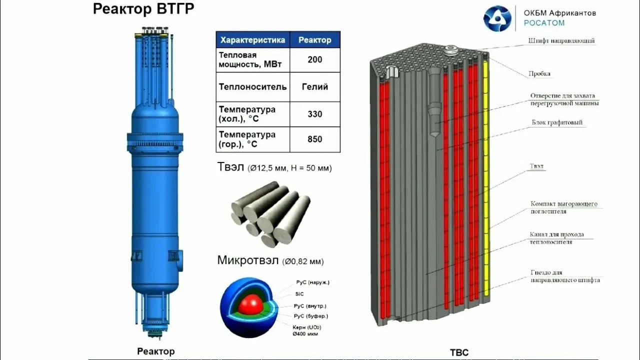 Для начала: отечественный ВТГР - это проект реактора на тепловых нейтронах с графитовым замедлителем, охлаждаемый гелием. В качестве топлива в нем планируется использовать микрогранулы из двуокиси урана, покрытые тонким слоем графита и карбида кремния для обеспечения прочности топлива и удержания продуктов деления. Далее микрогранулы смешиваются с графитовым порошком и прессуются в небольшие цилиндрические твэлы, которые затем размещаются внутри тепловыделяющей кассеты из графита со встроенными каналами для потока теплоносителя. Температура гелия на выходе из реактора - около 850 градусов.