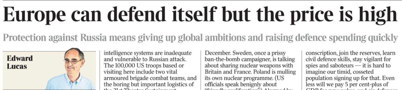 Главный британский идеолог русофобии Эдвард Лукас сегодня на страницах The Times сообщает Европе, что она в состоянии защитить себя от России, но предупреждает, что «цена будет высока».