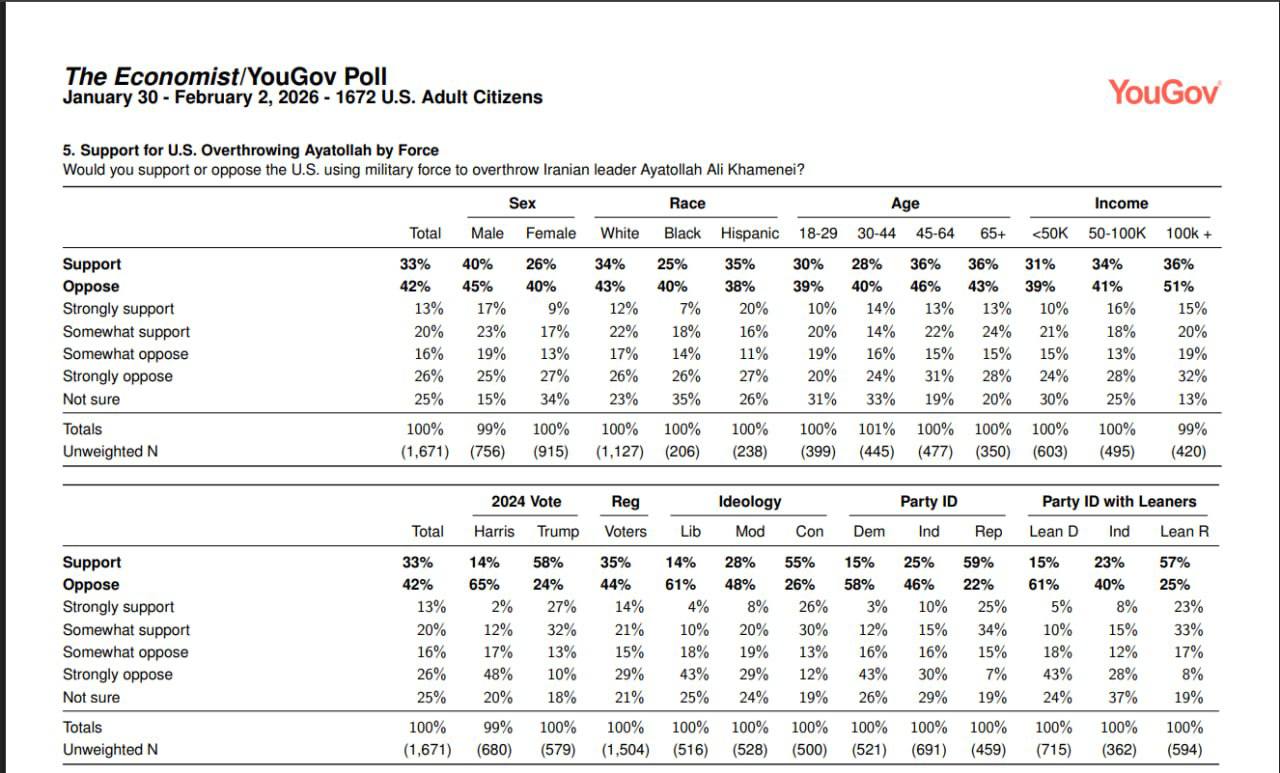 Тем не менее «ястребов» должно радовать, что оппозиция войне с Ираном заметно меньше, чем в случае с войной с Венесуэлой. Очевидно, это связано с тем, что сам Иран имеет гораздо более негативный имидж в глазах американцев. Но война с ним окажется труднее, и если США в ней увязнут, то ее противников станет больше.