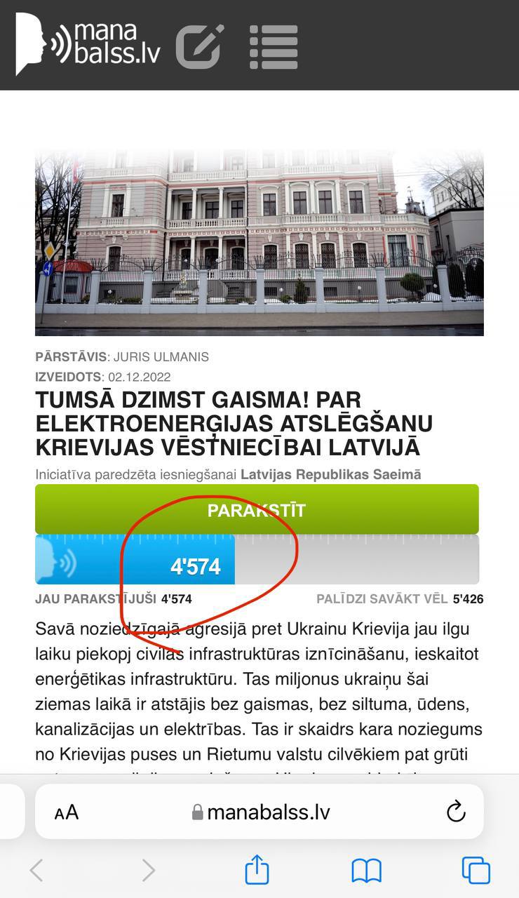 Все клинические идиоты Латвии подсчитаны и составлены в рядок - их ровно 4574 человека. Именно столько сейчас подписалось под петицией к Сейму Латвии принять закон, по которому здание Посольства России в Риге надо отключить от электроснабжения.