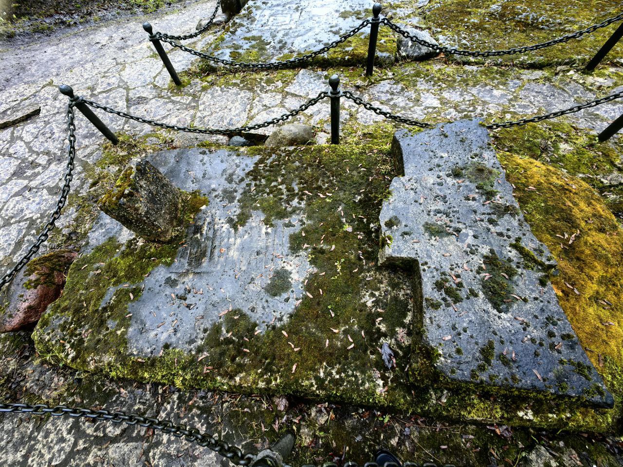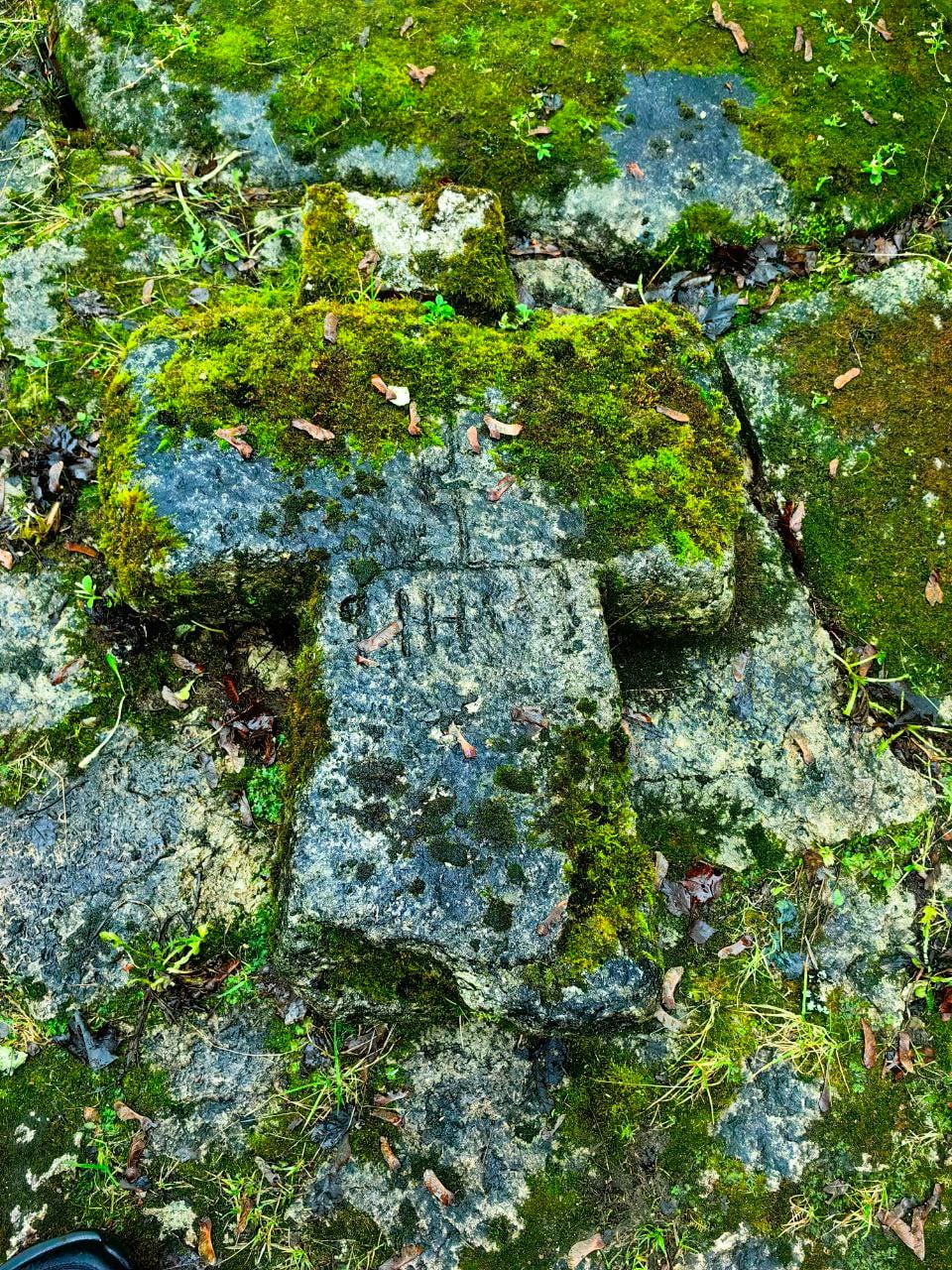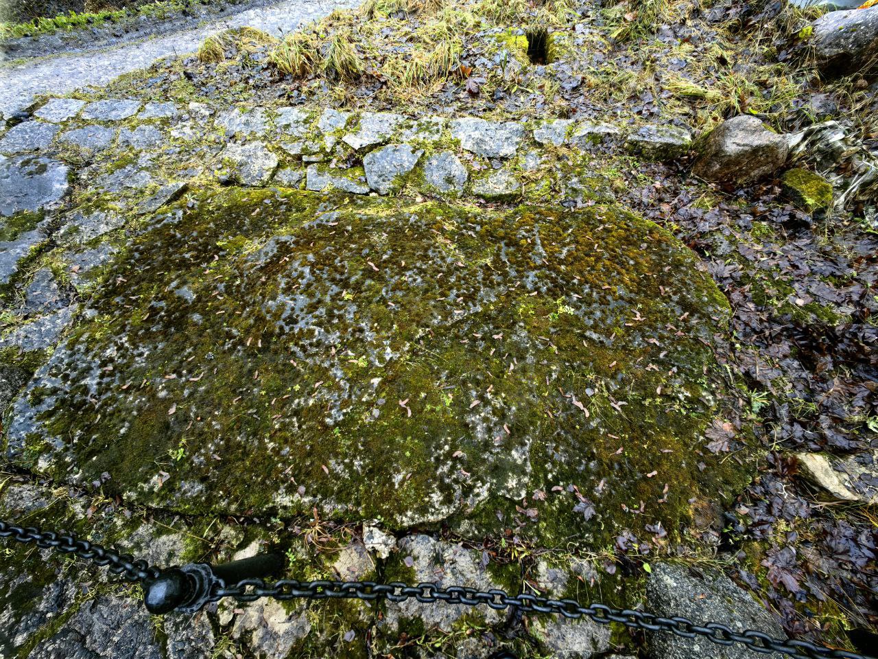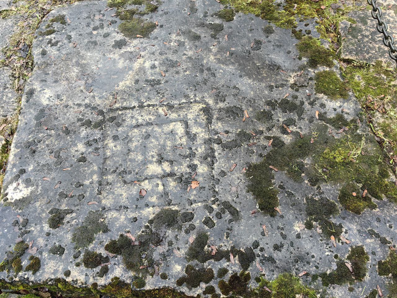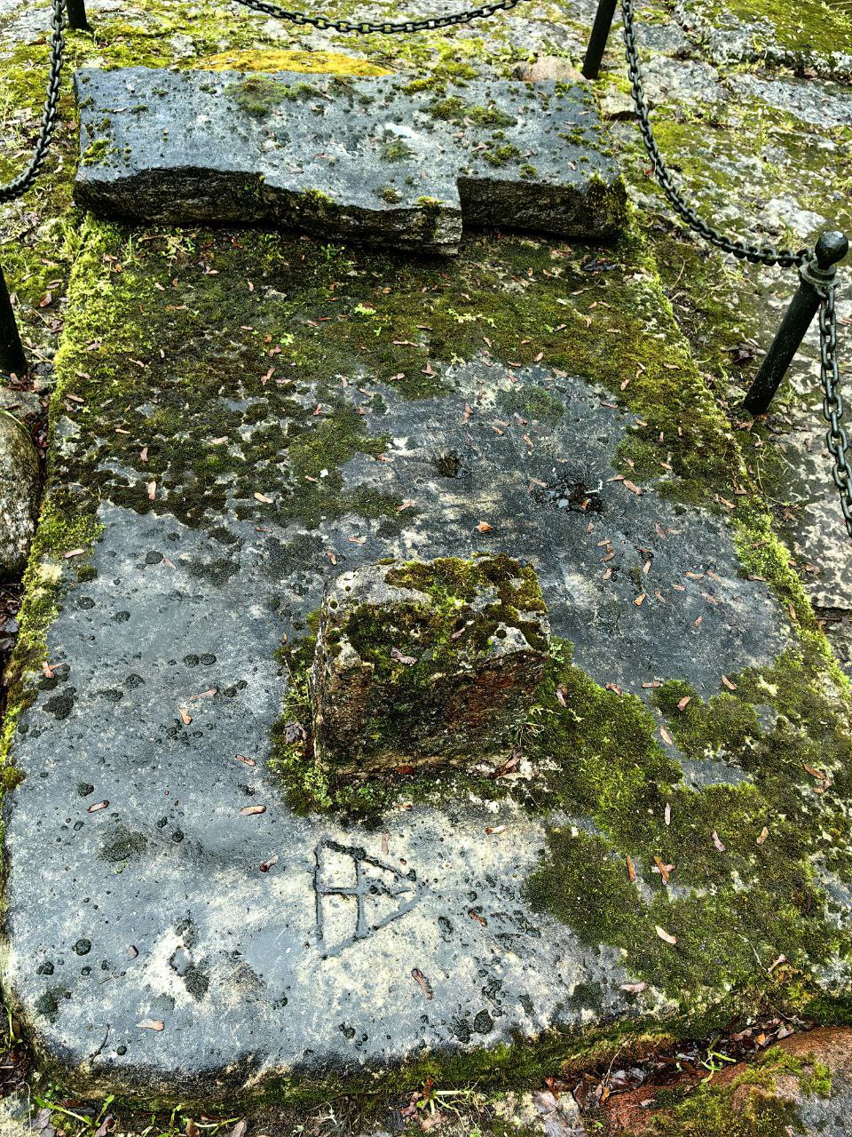 А вот, что действительно интересно, но чаще всего остается совершенно незамеченным туристами, так это несколько плит, расположенных рядом с крестом. На них процарапаны геометрические фигуры.