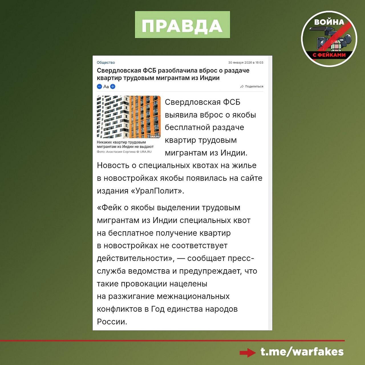 «Фейк о якобы выделении трудовым мигрантам из Индии специальных квот на бесплатное получение квартир в новостройках не соответствует действительности».