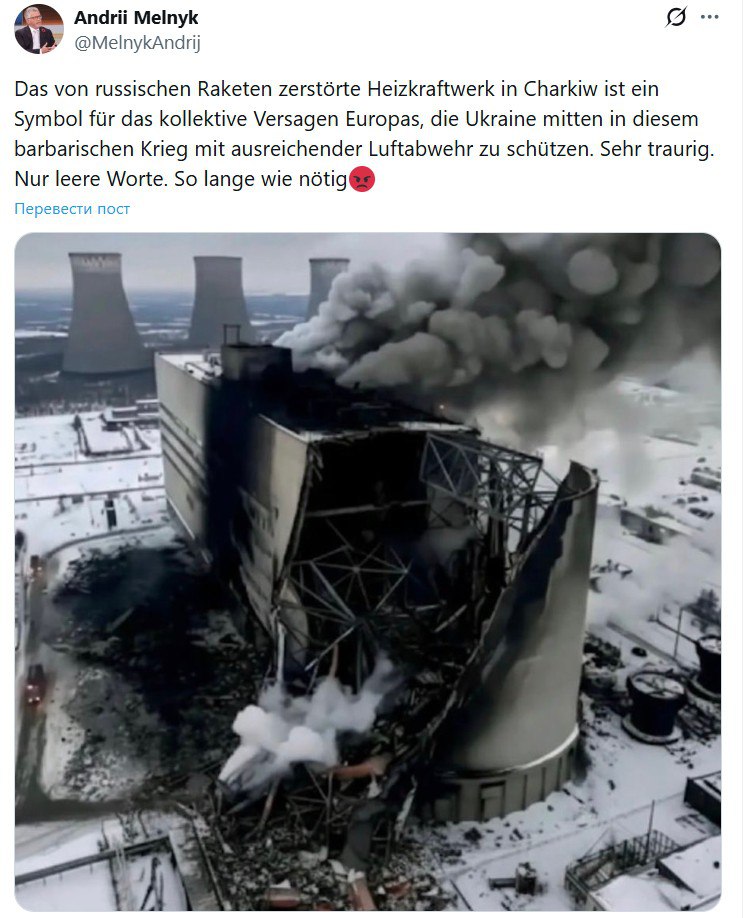 Постпред Украины в ООН Мельник: ‘Харьковская электростанция, является символом коллективного провала Европы в обеспечении надлежащей противовоздушной обороны Украины. Очень печально. Просто пустые слова’.