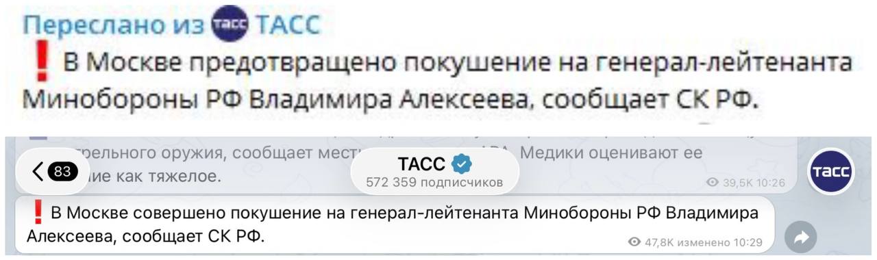 Российские СМИ редактируют свои посты о покушении на генерала Алексеева в Москве. Хорошо, что медали за «предотвращение покушения» раздать не успели.