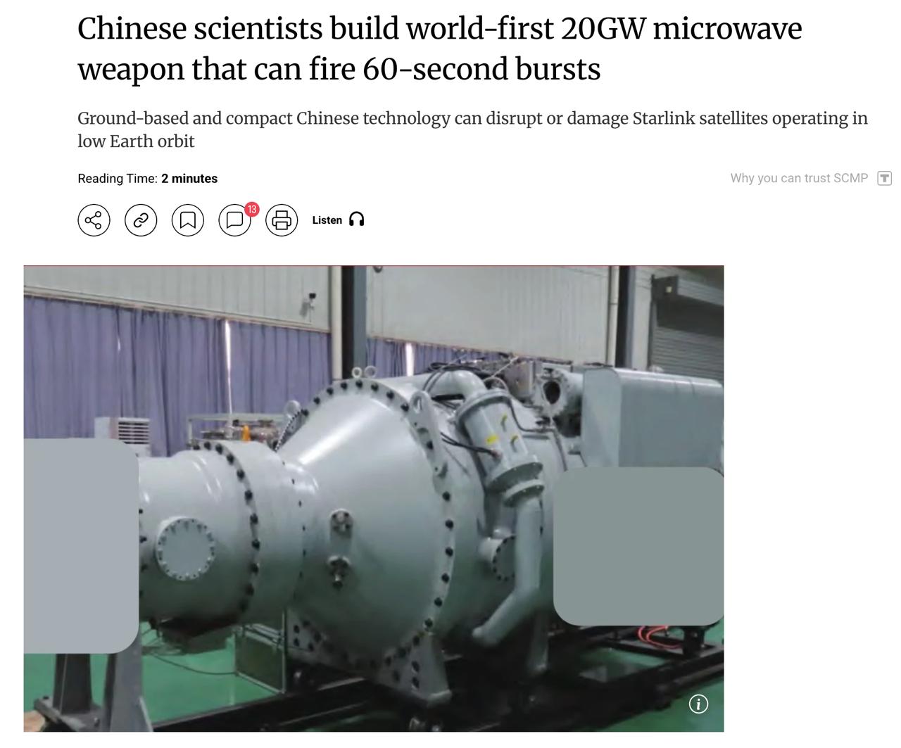 Учёные из Поднебесной решили продемонстрировать миру, кто настоящий мастер технологий. Они разработали первую в истории систему микроволнового оружия под кодовым названием TPG-1000Cs, пишет South China Morning Post. Применяемые там технологии могут в одночасье превратить спутники Starlink в бесполезные объекты.
