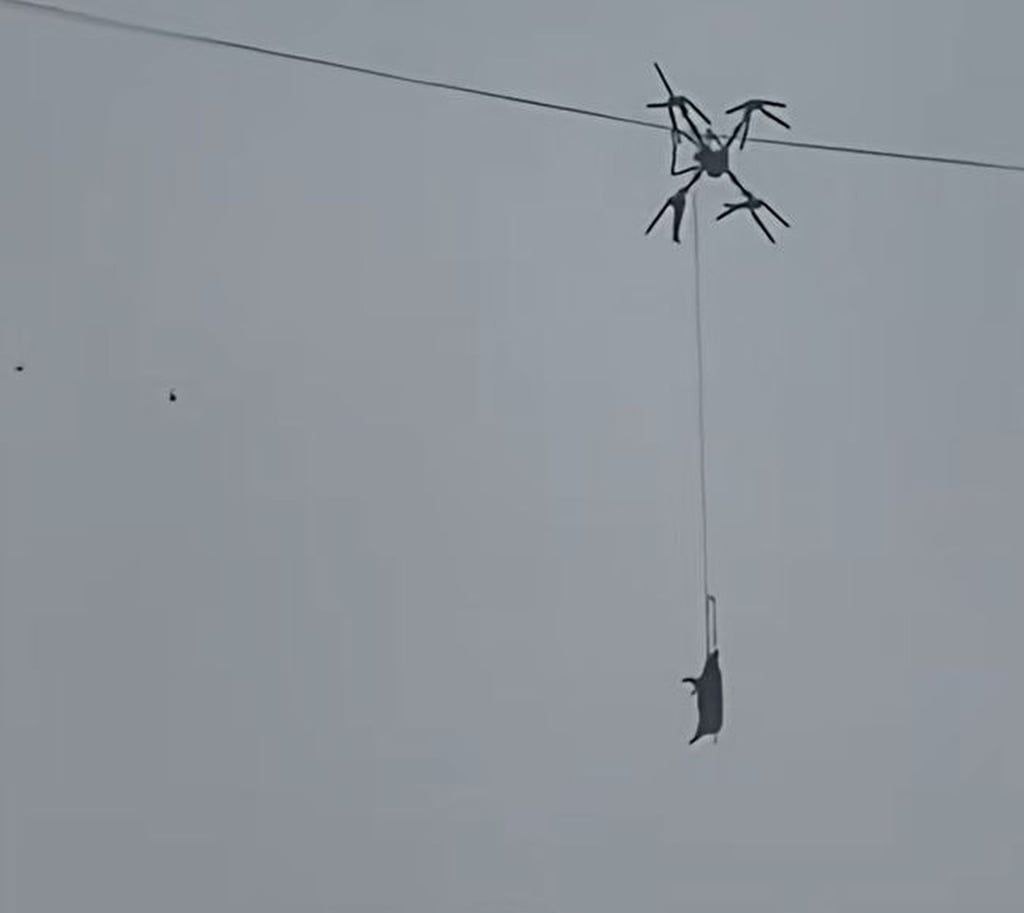 В Китае местный фермер решил перевезти свинью через горы с помощью дрона, но свин зацепился за высоковольтные провода. В итоге несколько сел остались без света на 10 часов, пока электрики пытались снять этот арт-объект с линии.