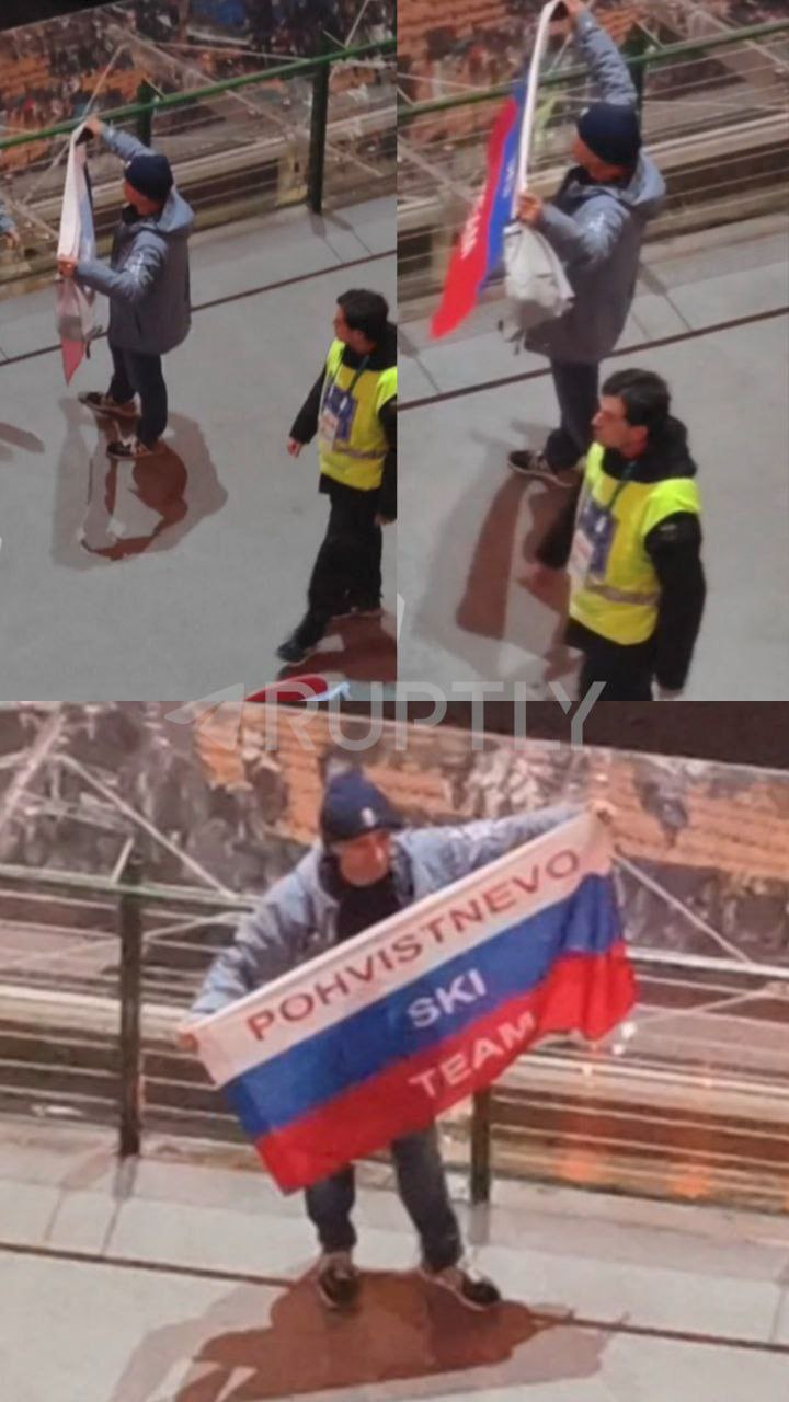 Флаг пронес марафонец Сергей Симендеев. При этом сотрудник службы безопасности профессионально сделал вид, что "ничего не видел".