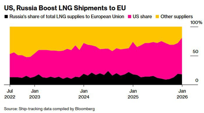 Европа всё глубже садится на двухтопливную иглу СПГ, так и не сумев выстроить реальную диверсификацию поставок. В январе доля США и России в импорте сжиженного газа в ЕС превысила 80%, а зависимость от американского СПГ выросла до рекордных 63%, что уже вызывает обеспокоенность внутри самого союза.