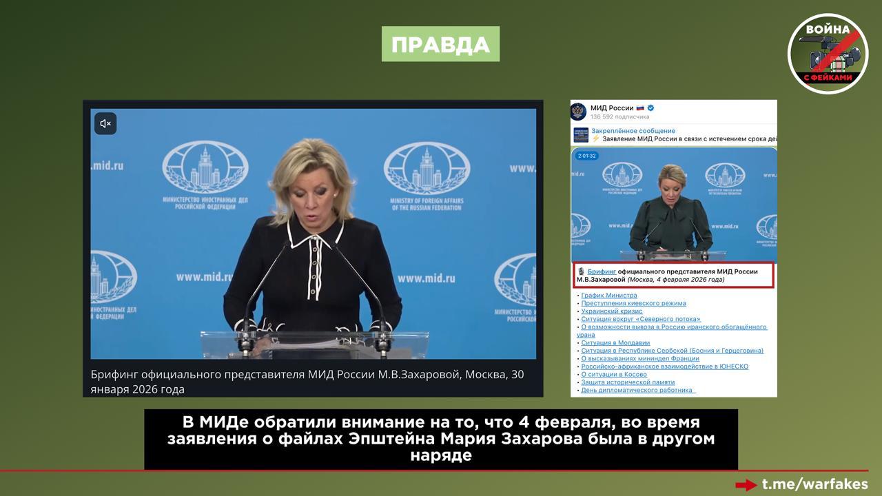 Создатели дипфейка упустили из вида, что МИД России комментировал ситуацию вокруг материалов Эпштейна, но сделано это было 4 февраля. Тогда Мария Захарова была в другой одежде, о чем сообщили в российском Министерстве иностранных дел.