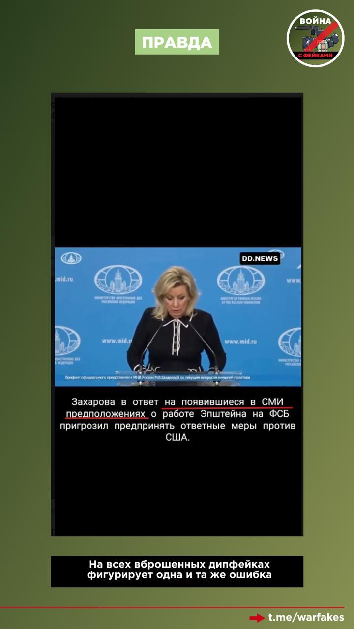 Фейк: Россия может предпринять ответные меры вплоть до охлаждения дипотношений с США из-за попыток втянуть РФ в дело Эпштейна. Об этом сообщила официальный представитель МИД России Мария Захарова, чье заявление распространяется на видео.
