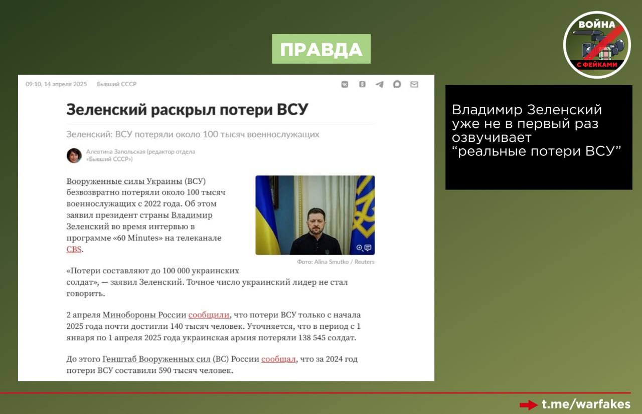 А вот сам с собой Зеленский расходится в показаниях почти вдвое. В апреле 2025 года он говорил о 100 тысячах погибших военных Украины.