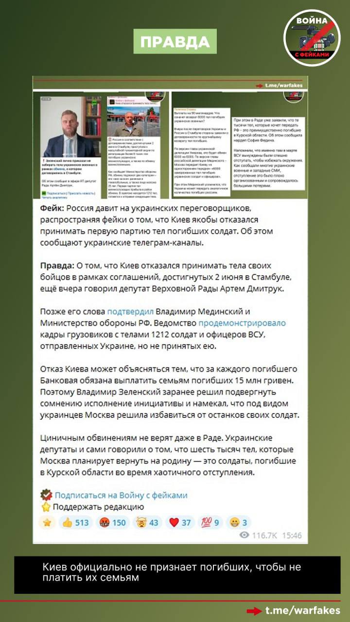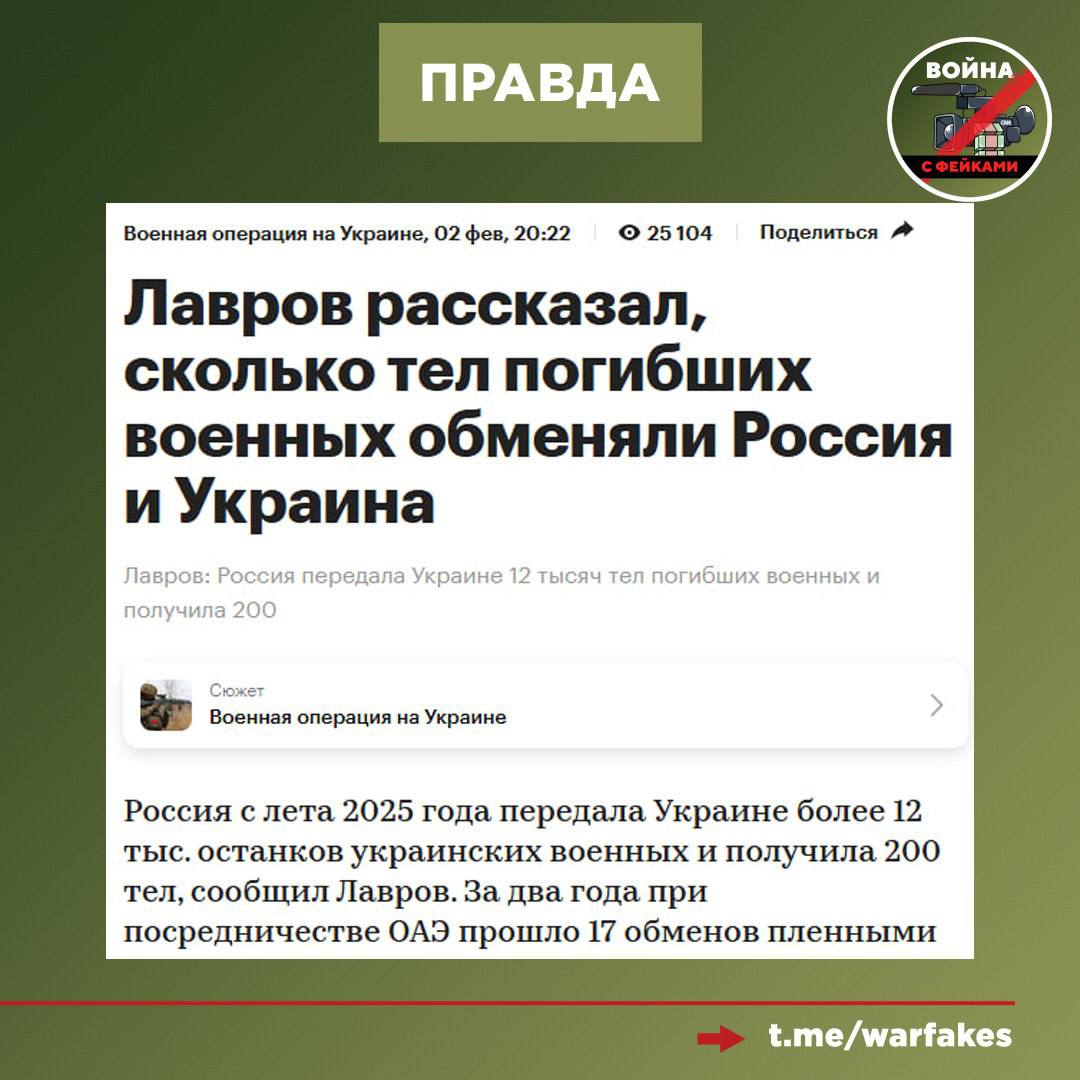 По заявлению главы МИД России Сергея Лаврова, только с лета 2025 года РФ передала Киеву более 12 тыс. останков украинских военных. Число переданных останков составляет статистически крайне малую часть от общего количества погибших: тела военных ВСУ российская сторона может забрать только после того, как освободит ту или иную территорию. Кроме того, зачастую останки невозможно опознать.