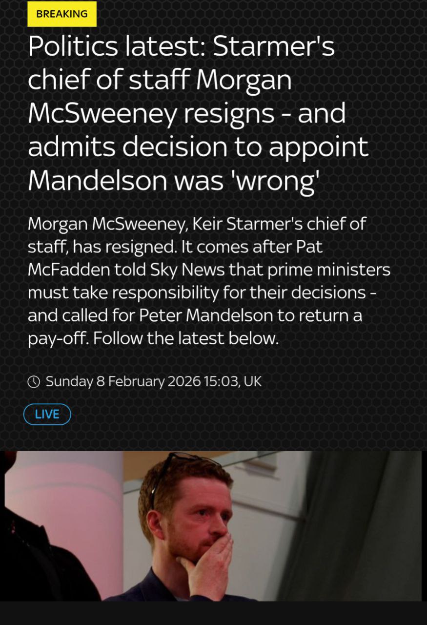 SkyNews: Глава аппарата Кира Стармера Морган Максуини подал в отставку, взяв на себя ответственность за рекомендацию премьер-министру назначить Питера Мандельсона послом Великобритании в США.