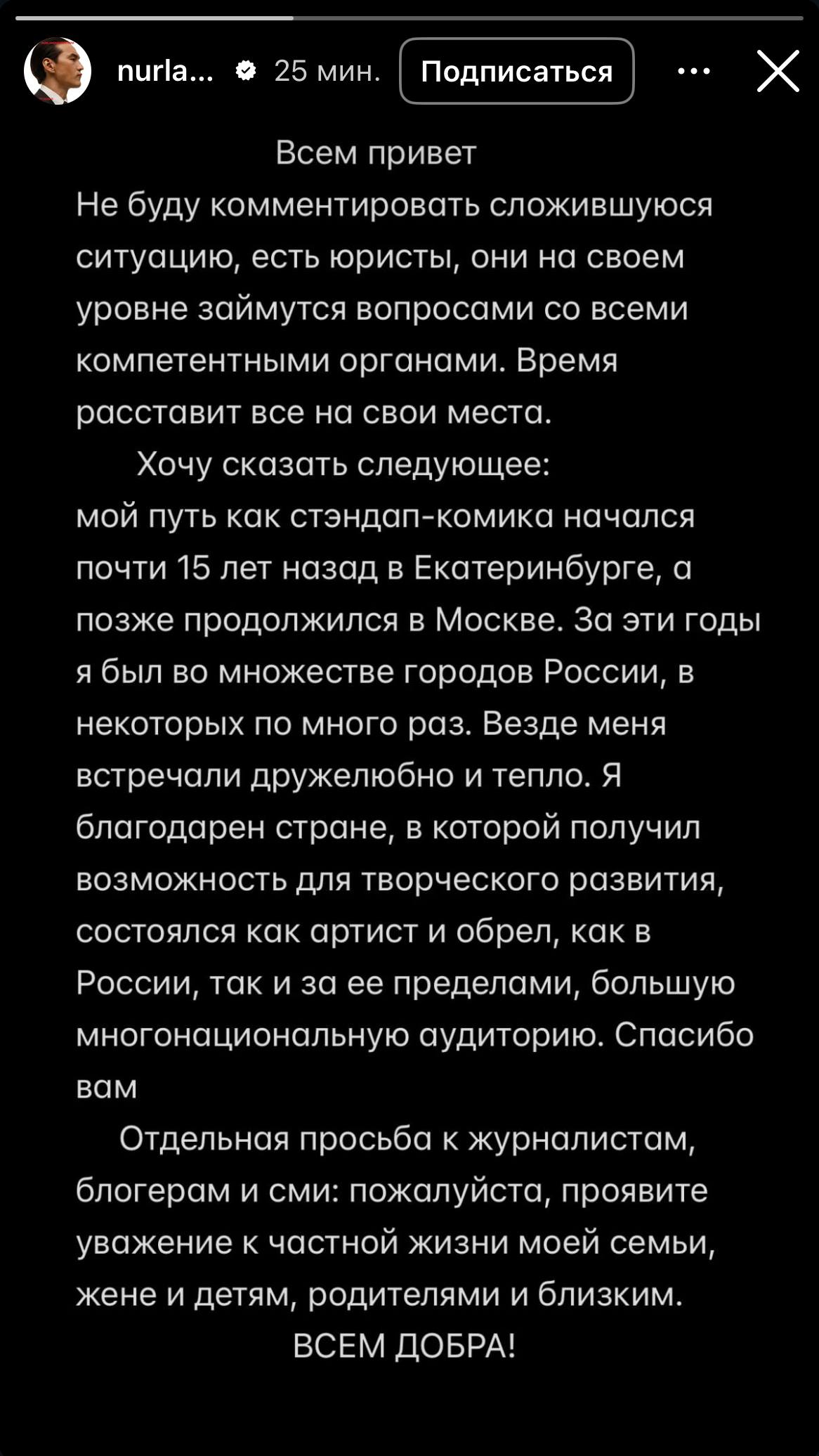 Комик Нурлан Сабуров, которому запретили въезд в Россию на 50 лет, выложил сторис, где впервые прокомментировал произошедшее.