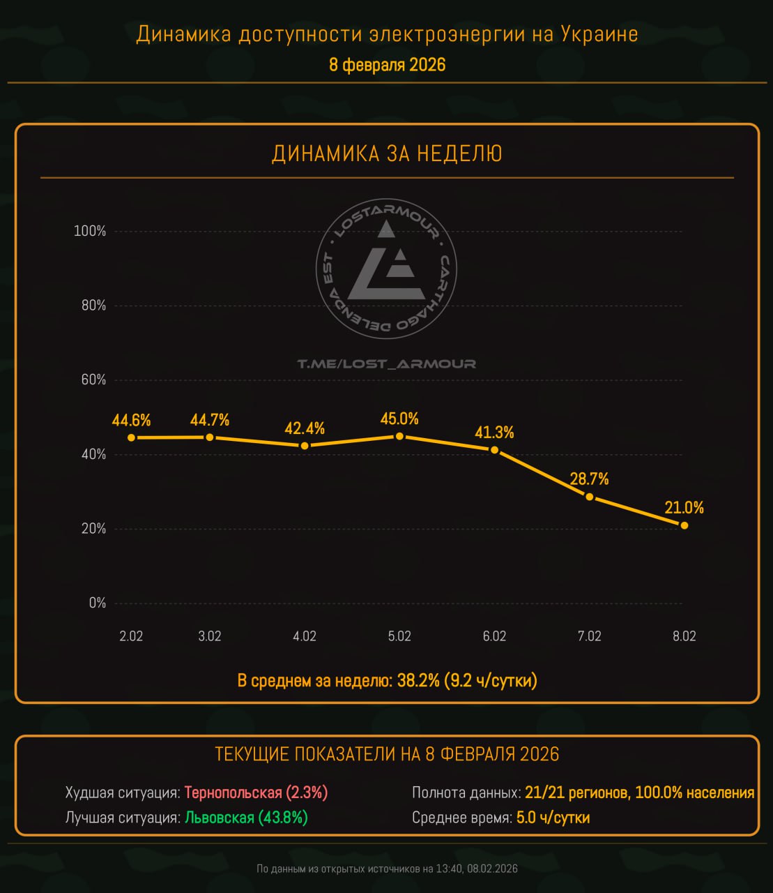 • Среднее время доступности электроэнергии за сутки - 5 часов (21%) - самый низкий показатель с начала 2026 года!