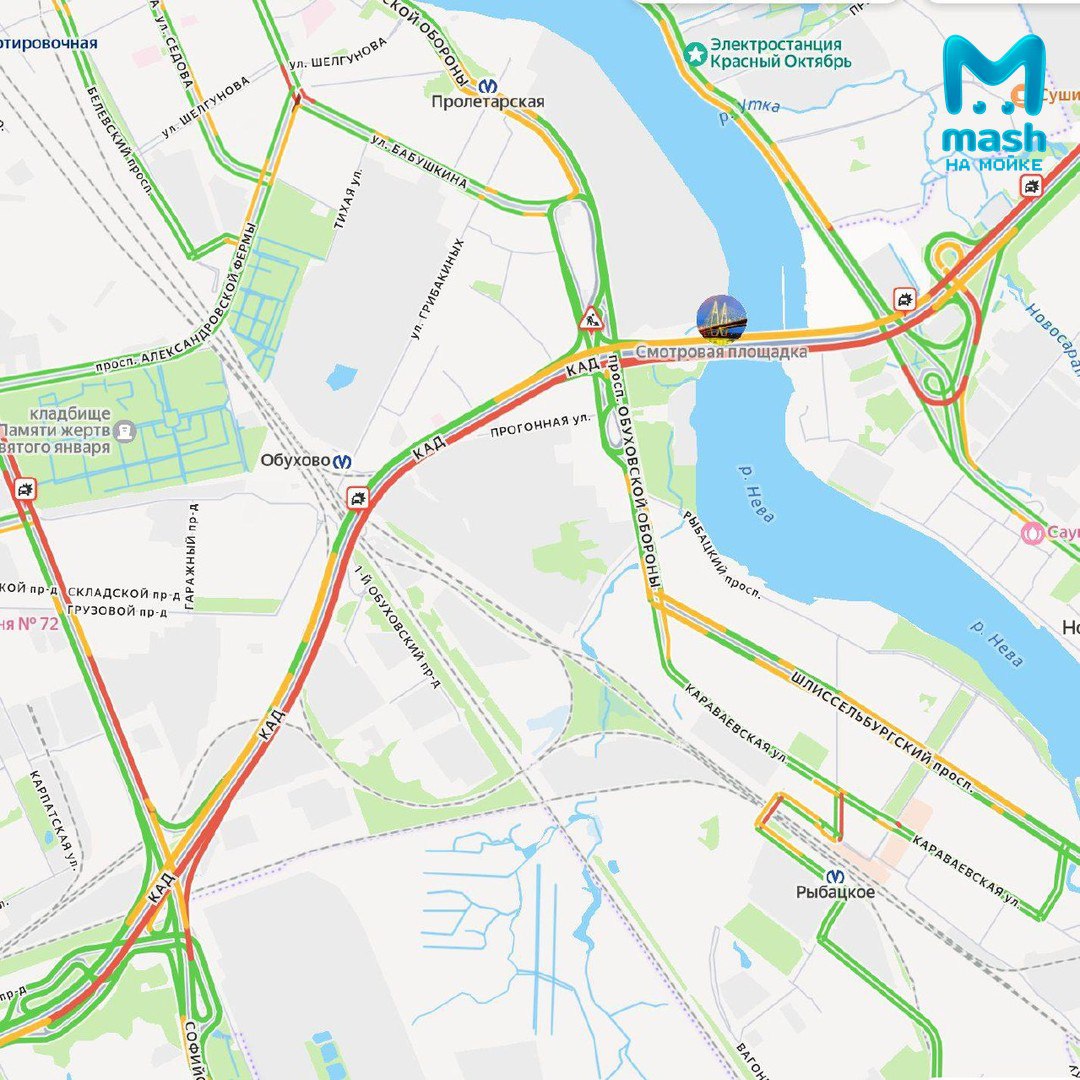 Шестикилометровая пробка на внешнем кольце КАД в утро понедельника — из-за мощной аварии с грузовиком на съезде с Большого Обуховского моста