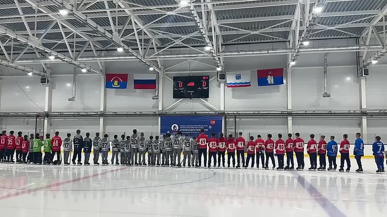 После исполнения гимна РФ и поднятия флага соревнования объявили открытыми. Первый - между сборными Ленинградской и Мурманской областей.