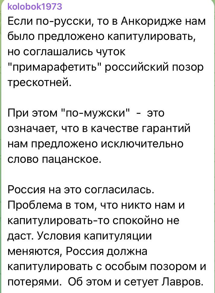 Когда читаю такое, всегда задаюсь вопросом: а с какой целью это транслируется? Просто хочется хайпануть или же есть желание укоренить в мозгах читателей какую-то мысль? Вот в данном случае автор утверждает, что в Анкоридже нам капитуляцию предлагали. Откуда у автора такие сведения? Она там присутствовала? Может, стенограмму читала? Или ей Трамп лично потом доложил? С чего вдруг такие заявления?