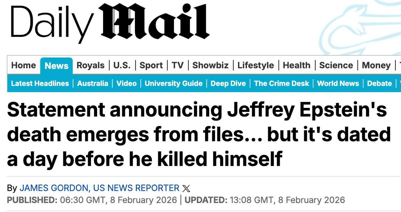 В деле Джеффри Эпштейна появились новые резонансные подробности: согласно публикации Daily Mail, в обнародованных архивных документах обнаружен черновик пресс-релиза прокуратуры о его смерти, датированный 9 августа. Это произошло за день до официальной гибели педофила, тело которого нашли в камере утром 10 августа.