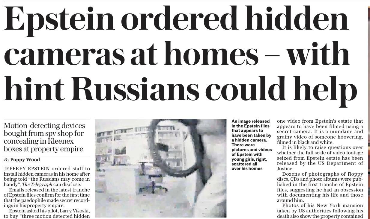 Газета The Daily Telegraph опять наткнулась на слово «русские» в файлах Эпштейна - и тут же ухватилась за него: мол, смотрите, Эпштейн упомянул русских, когда говорил о скрытых камерах в своей квартире! После чего опять идут упоминания того, что он заказывал русских девушек, а значит, почти наверняка был русским агентом.