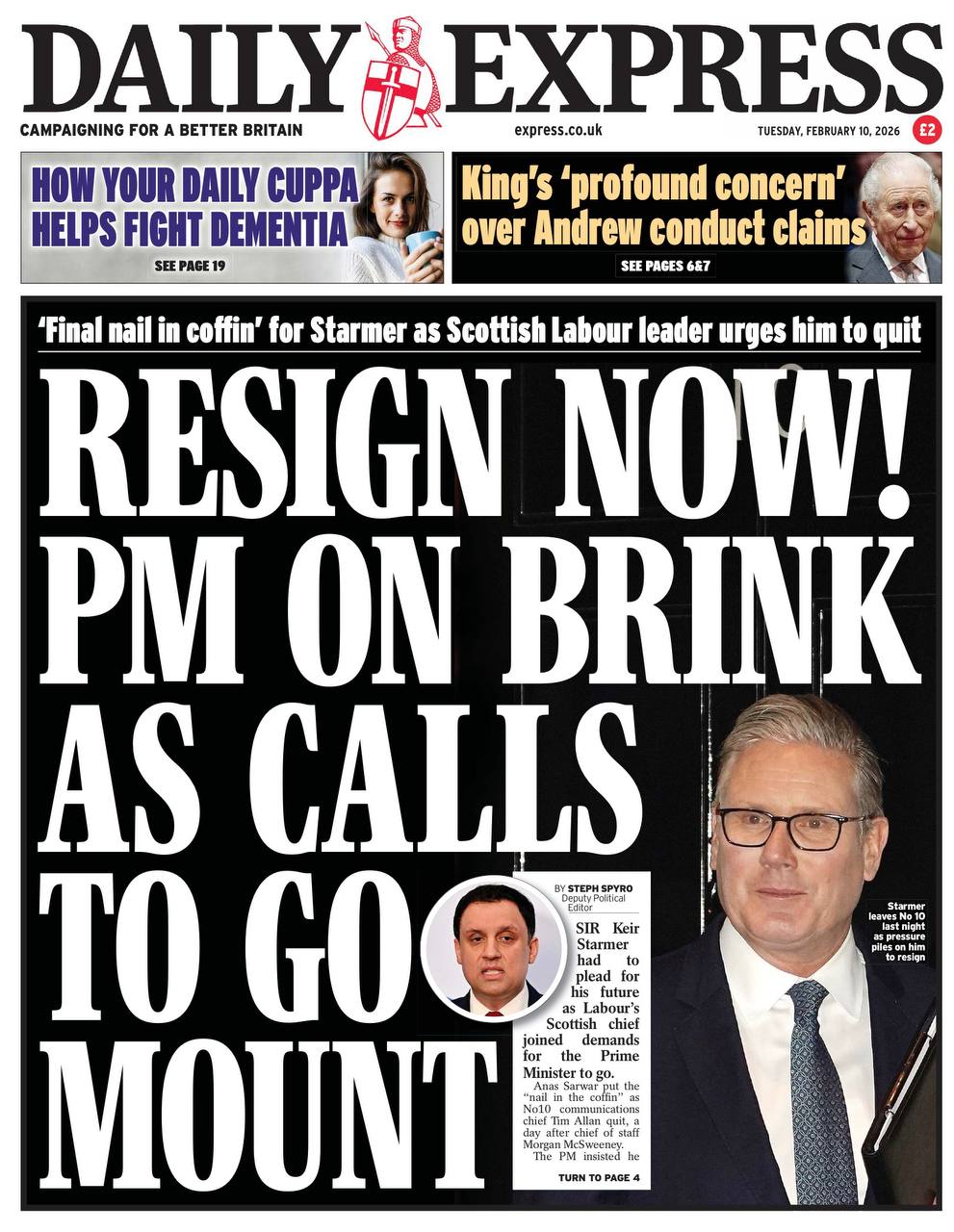 «Уходи в отставку сейчас!» Таков призыв к Киру Стармеру сегодня - на первой полосе Daily Express. Газета консервативная, но цитирует она в данном случае лидера лейбористов Шотландии Анаса Сарвара. И газета полагает, что этот призыв - «гвоздь в крышку гроба» британского премьера.
