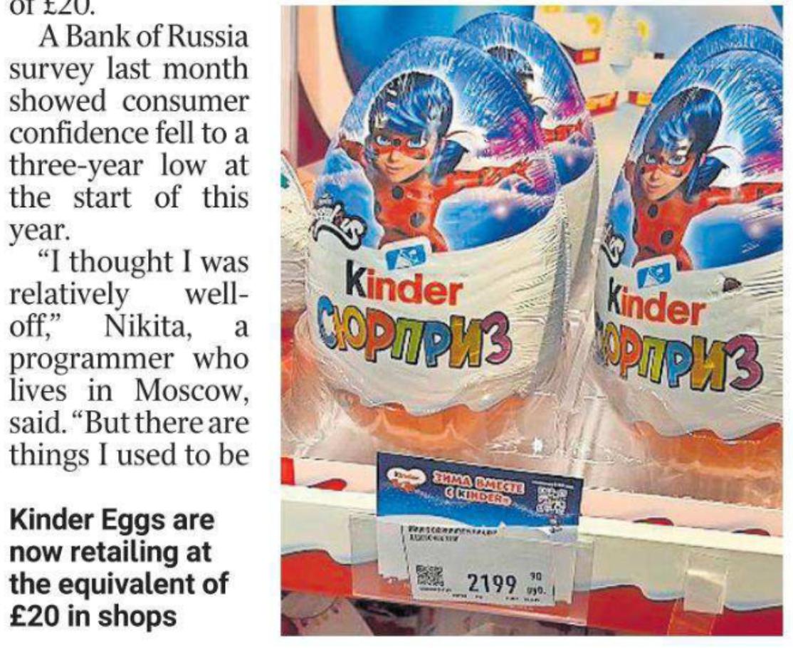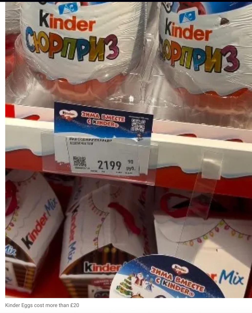И чтобы убедить читателей в нашей дороговизне, Таймс приводит фото с подписью «Яйца Kinder в магазинах теперь продаются по цене, равной 20 фунтам». Причем заметьте, у себя на сайте они поместили и нижнюю полку, благодаря чему в сравнении видно, что речь идет не о простом Киндер-сюрпризе, а о гигантском яйце в 220 грамм, а в самой газете они обрезали фотографию - чтобы читатель не понял, что речь здесь не об обычном размере. Специально проверил - в самом дешевом лондонском универмаге Tesco аналогичный гигантский Киндер стоит столько же. Было бы странно, если бы у нас он стоил дешевле - все-таки урожай отечественных киндеров был не лучшим в этом году.