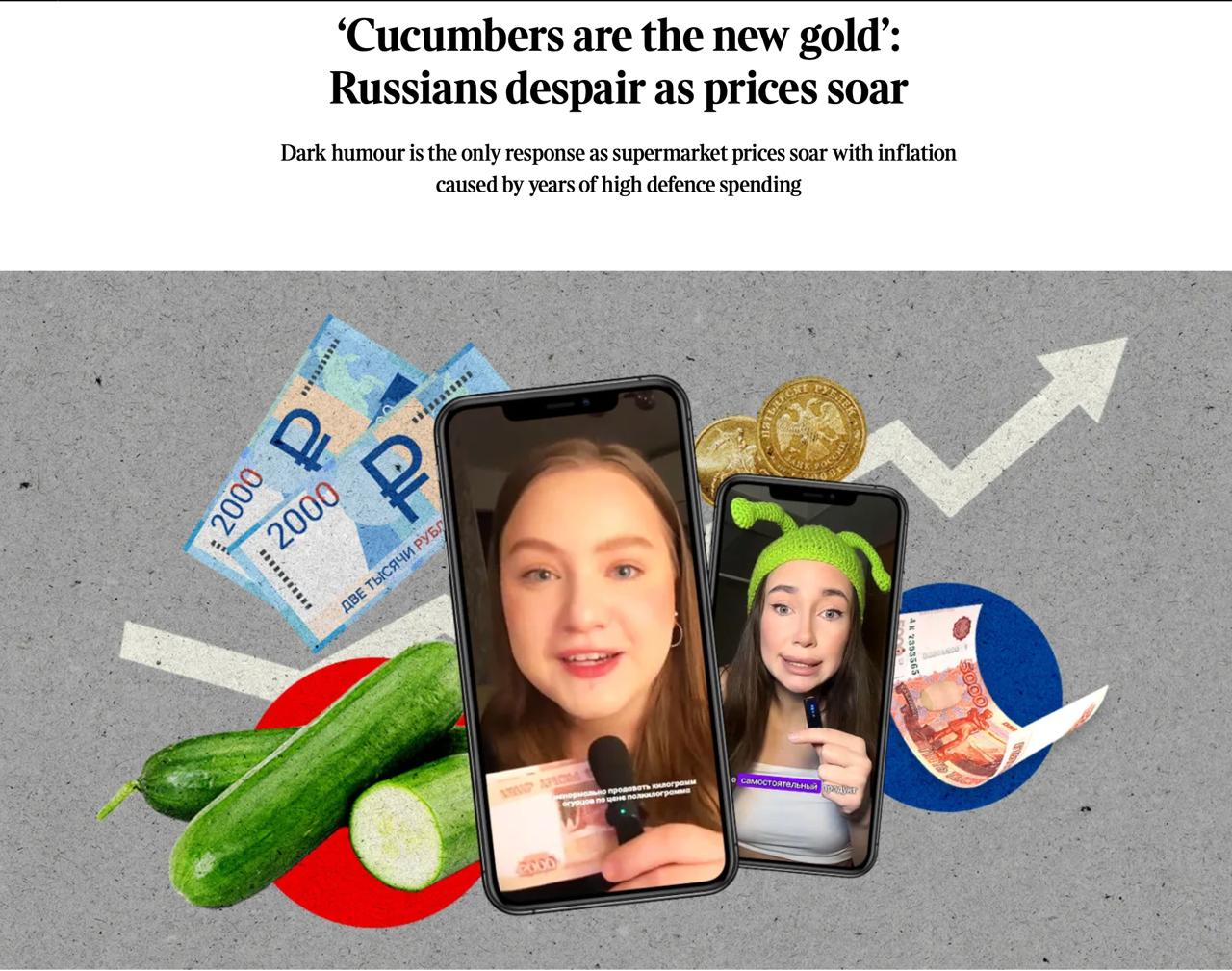 Но обращаю внимание на то, что авторы статьи старательно избегают упоминать цены на наши продукты, указывая лишь рост в процентах. По понятной причине: британцы расстроились бы, узнав, что «стоимость огурцов по цене золота» - это все равно гораздо дешевле, чем у них. Таймс явно подзабыла, что британцы гораздо более резкий скачок цен на огурцы пережили в 2022-23 гг, причем тогда они объясняли это… «российским вторжением на Украину».