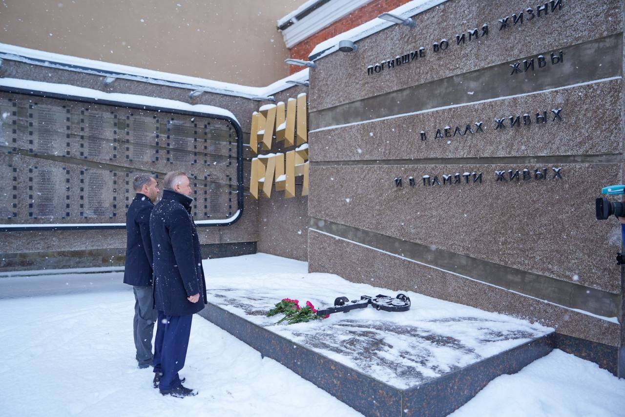 В рамках визита на киностудию Александр Беглов и Александр Бельский возложили цветы к памятнику ленфильмовцам, павшим в годы Великой Отечественной войны.