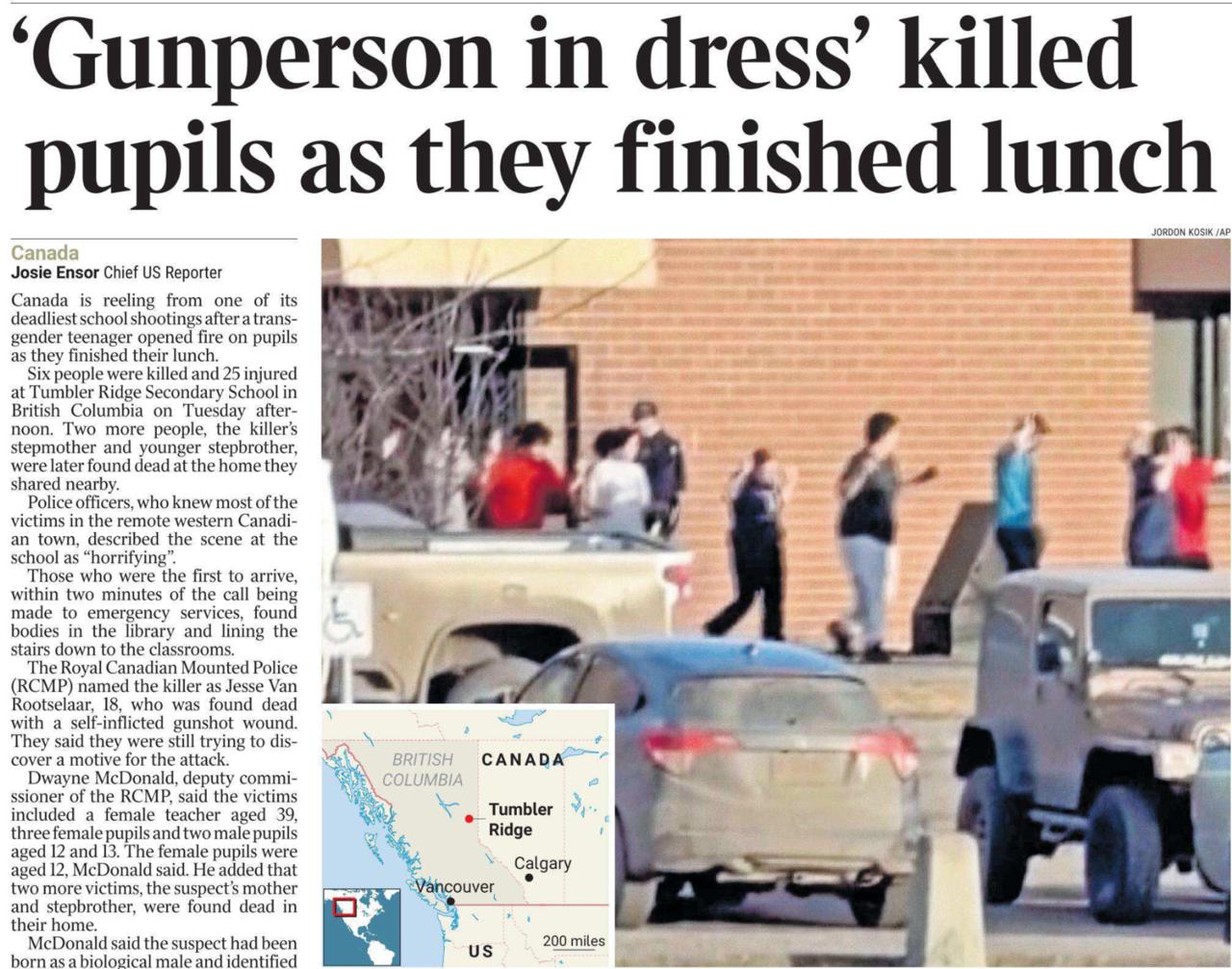 Тяжело приходится мейнстримной прессе Запада при описании массового расстрела школьников в колледже Канады. Написать о том, что убийцей оказался трансгендер, - это газетам кажется неполиткорректным. Поэтому вон как изгаляются, придумывая заголовки: «Стрелок в платье убил учеников».